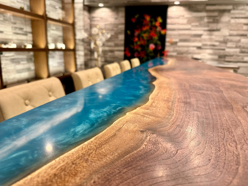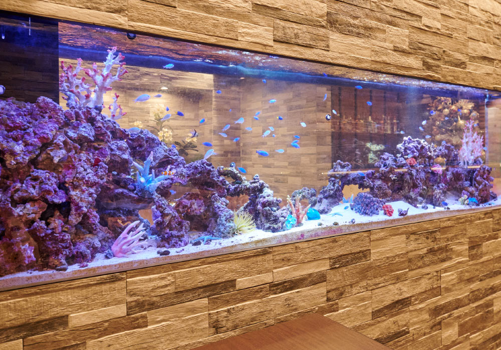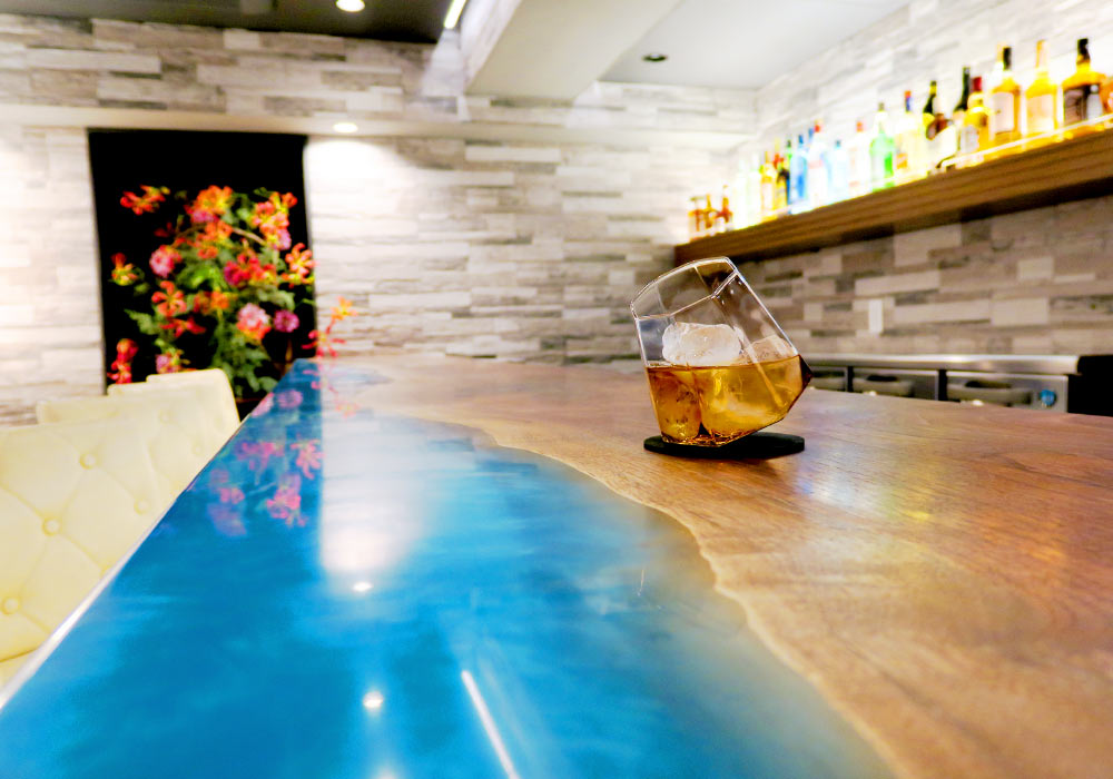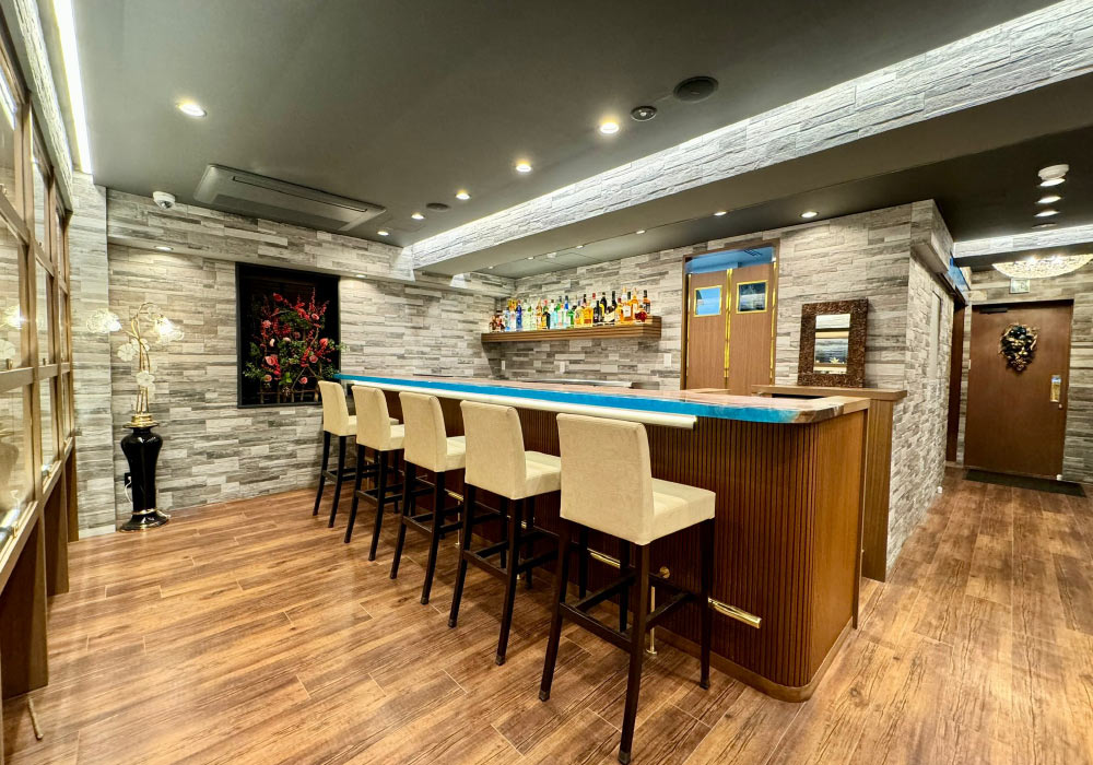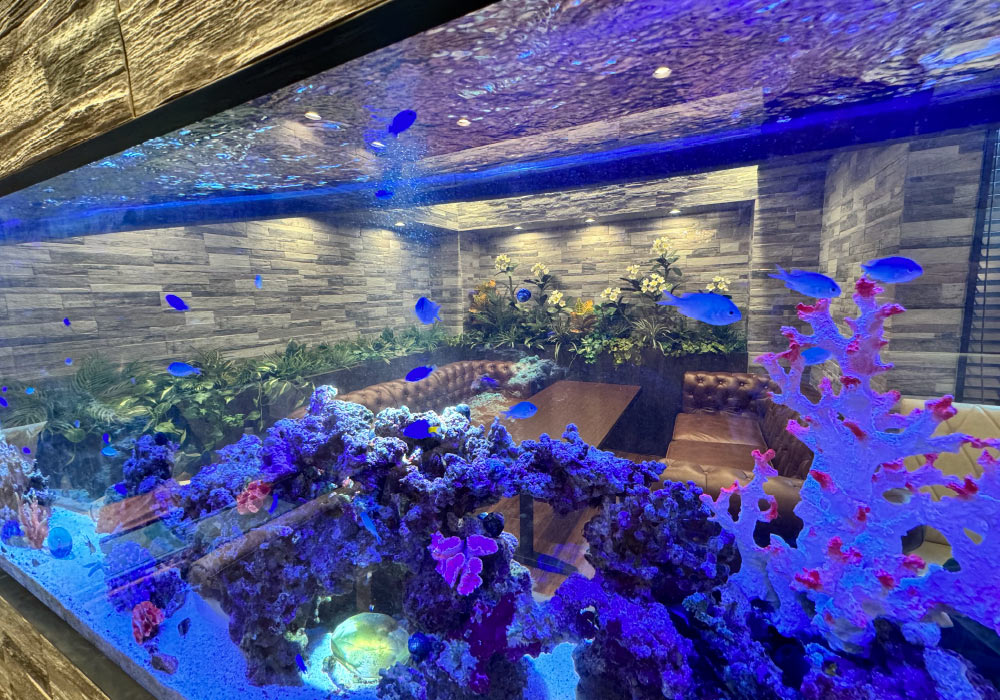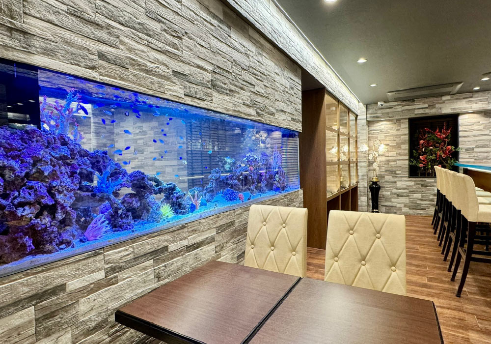 南国の花「プルメリア」をモチーフに、海辺のリゾート・ホテルのラウンジをイメージした、温かみある空間となっております。店内のアクアリウムを眺めながら、至福のひとときをお過ごし下さいませ。